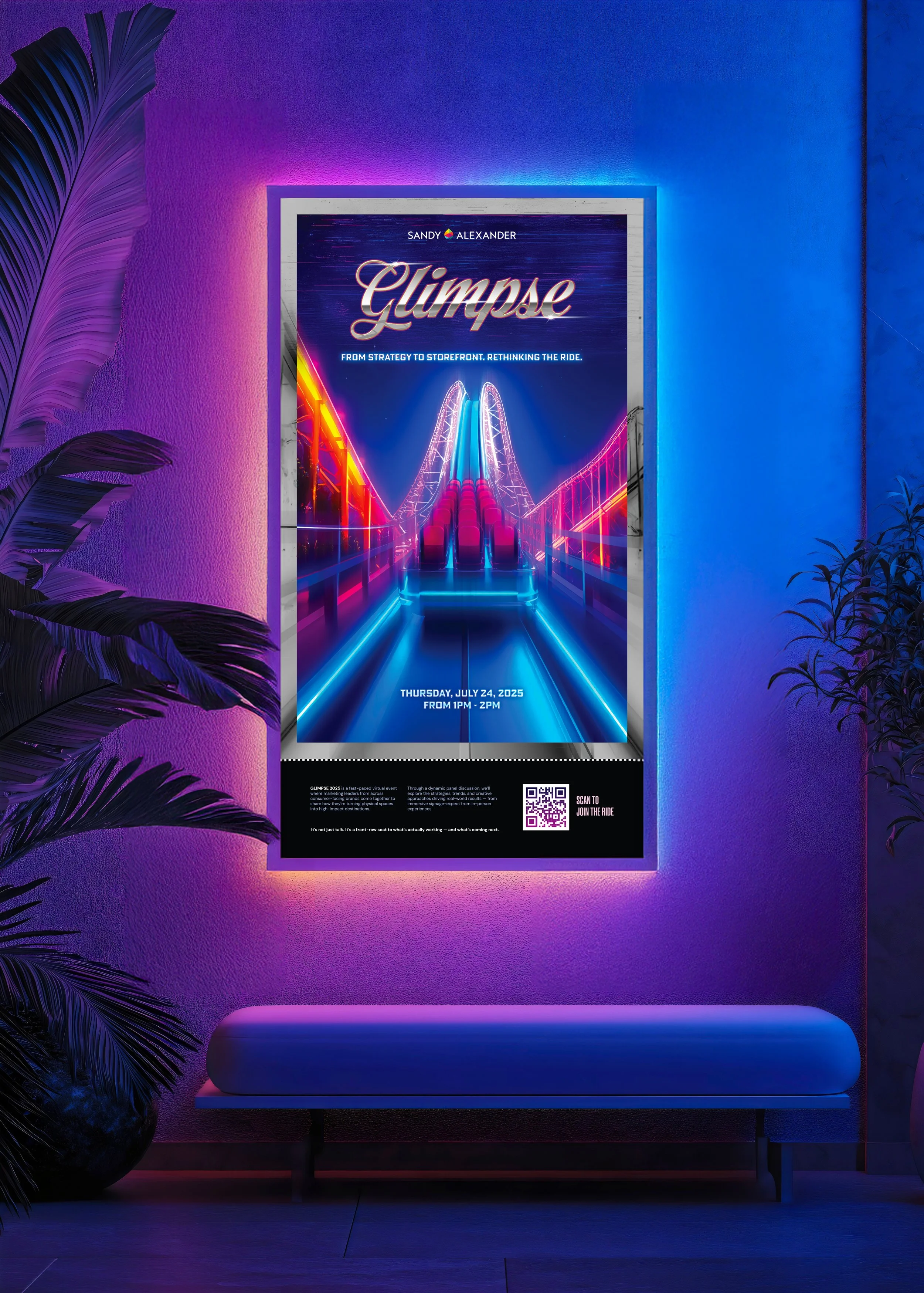Created promotional materials for Sandy Alexander’s Glimpse event, including an event poster and social videos. The design featured a neon night roller coaster aesthetic, holographic aluminum accents, and a perforated ticket-style format to reinforce exclusivity and anticipation.